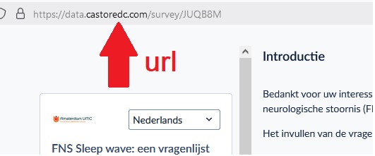 – Als je toch alles af wilt sluiten, kun je de url van jouw vragenlijst even kopiëren en naar jezelf mailen. de url begint met https: // data.castor… etc. Zie het plaatje hieronder. Als je de volgende dag deze link aanklikt, kom je weer in jouw vragenlijst. Je moet alleen even doorklikken naar de pagina waar je bent gebleven. Dit kun je meerdere keren doen, dus je kunt rustig 5 dagen nemen om elke dag een klein stukje in te vullen.