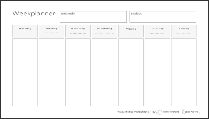 Ze zijn eenvoudig, simpel en in grijstinten. Saai? Misschien, maar ook prikkelarm. Er zijn een basic dagplanner en weekplanner met ruimte voor je dag of week. Maar we hebben ook een dagplanner en een weekplanner gemaakt met ruimte voor je FNS. Wil je juist bijhouden hoe je het doet in zo’n drukke periode? Speelt je FNS meer op of minder, hoe voel je je, hoe slaap je? Dit kun je in de speciale FNS-planners ook bijhouden.