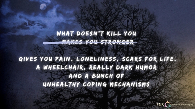 We leven in een wereld waar een ‘maar’ verplicht is. Je mag niet zeggen hoe klote je leven met FNS is en dan eindigen met een punt. Nee, er moet een ‘maar’ achter die de wereld laat zien hoe sterk en dapper en moedig je bent.