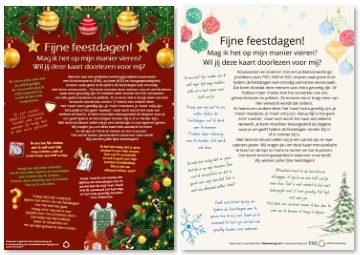 Met FNS kunnen de feestdagen overweldigend zijn. Het zijn dagen die vooral draaien om samen zijn en gezelligheid. Maar het zijn ook dagen waarin mensen die extra gevoelig zijn, zoals met FNS of een NAH, nog meer druk ervaren. Er heerst een andere sfeer, je ‘moet’ gezellig zijn, je ‘moet’ meedoen, je ‘moet’ erbij zijn.Meer lezen over “Kerstkaart voor FNS-ruimte”